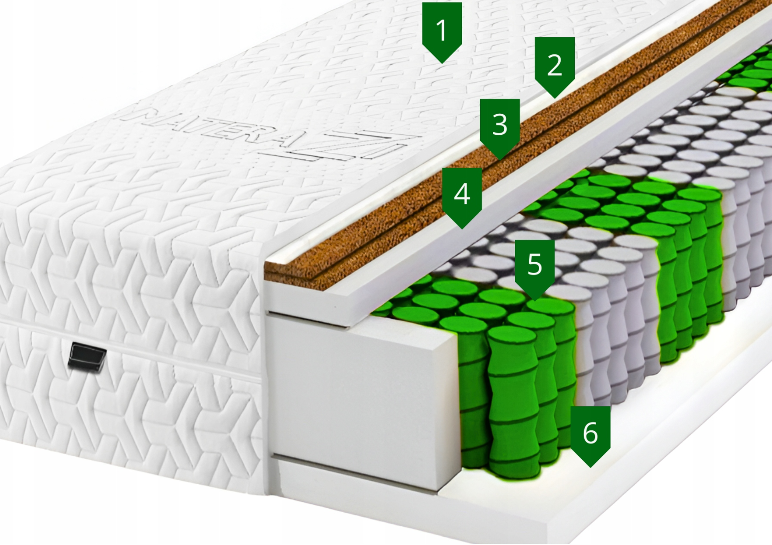 Natūralus kokoso pluoštas sutvirtina čiužinį, pagerina vėdinimą ir prailgina tarnavimo laiką. Vieną iš kokoso kilimėlių galima perkelti, todėl galima reguliuoti čiužinio kietumą pagal poreikį.
