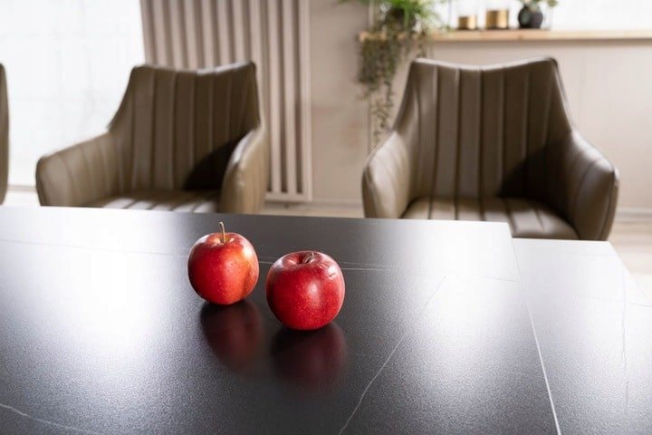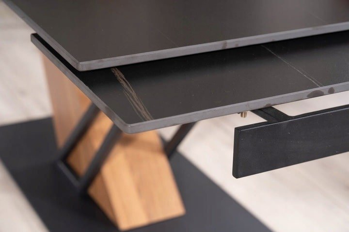 Šis išskirtinis stalas yra puikus pasirinkimas bet kuriai moderniai namų ar net restorano erdvei. Rafinuotas dizainas pritrauks kiekvieno dėmesį. Rėmas pagamintas iš kokybiško metalo ir MDF plokštės, o stalviršis – keramikinis su marmuro efektu. Šis stalas pagamintas iš aukščiausios kokybės medžiagų, kurios garantuoja ne tik ilgalaikį funkcionalumą, bet ir atsparumą įvairiems pažeidimams. Nepriklausomai nuo ilgo naudojimo, jo išvaizda ir kokybė išliks nepakitusios. Stalą transformerį labai lengva prižiūrėti, valymui tinka, bet kuri neagresyvi priežiūros priemonė.