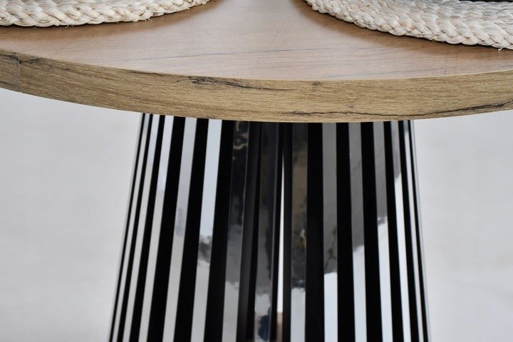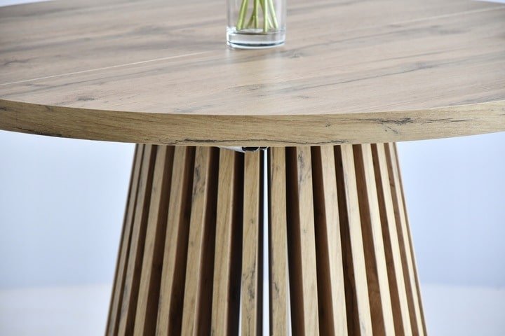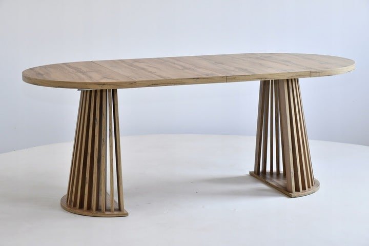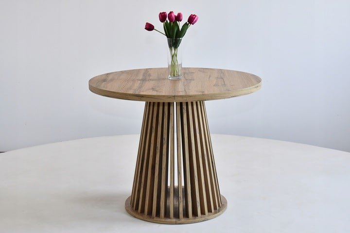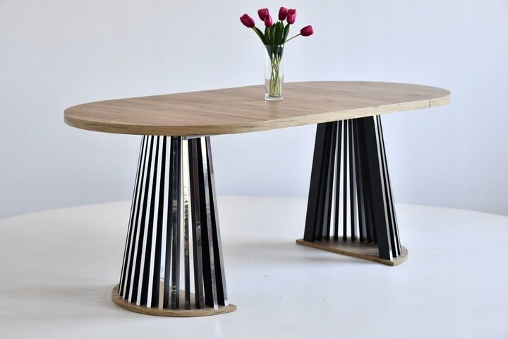 Stalviršis ir pagrindas yra pagaminti iš abiejų pusių laminuotos plokštės , kuri yra idealus sprendimas kasdieniam naudojimui, dėl aukšto atsparumo mechaniniams pažeidimams, aukštai temperatūrai ir nešvarumams. Modernios ir išskirtinės stalo kojos prikaustys kiekvieno svečio dėmesį. Stale yra 2 prailginimo įdėklai (2 x 50 cm), kurių pagalba mažas kavos stalas gali tapti dideliu šeimos pietų stalu.