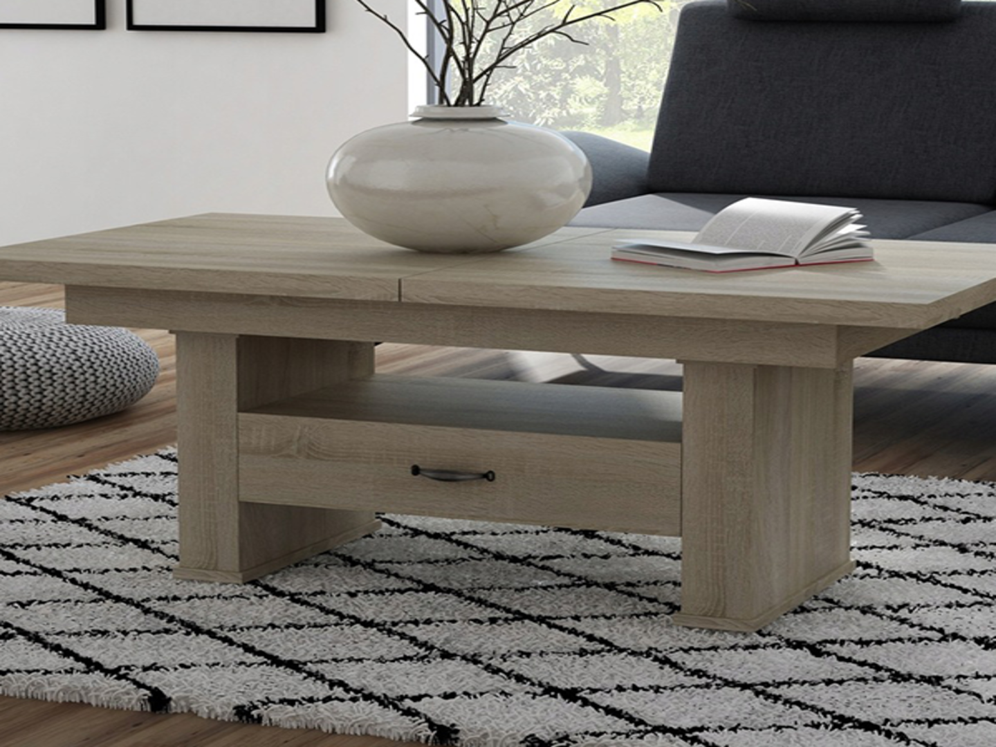 Stalas pagamintas iš abiejų pusių laminuotos plokštės, stalviršis pastorintas dėl šių priežasčių stalas yra stabilus ir ypatingai tvirtas. Stalviršio briaunos apsaugotos PVC juostele, apsaugančia stalo elementus nuo mechaninių pažeidimų. Stalas turi išskleidimo ir pakėlimo funkciją. Jis tiks ir kaip kavos staliukas, ir kaip stalas visai šeimai per pietus ar vakarienę. Šis modelis turi stalčių, todėl daugelį turimų daiktų galėsite lengvai paslėpti jame. Taip sutaupysite vietos ir turėsite kur pasidėti nenorimus ant stalo laikyti daiktus. Stalą transformerį labai lengva prižiūrėti ir valyti. Valymui tinka, bet kuri neagresyvi priežiūros priemonė skirta laminuotai plokštei.