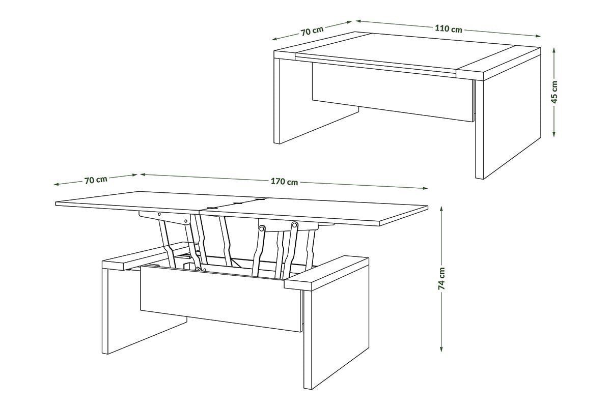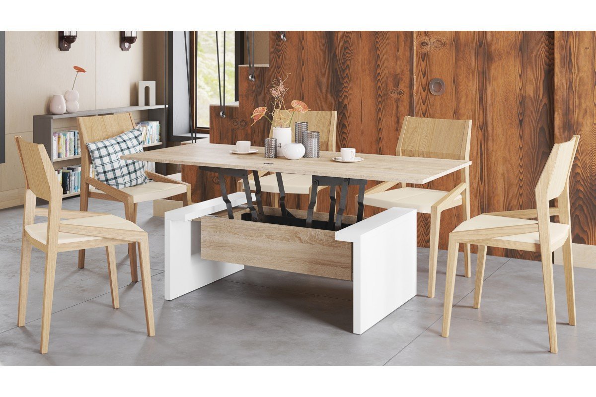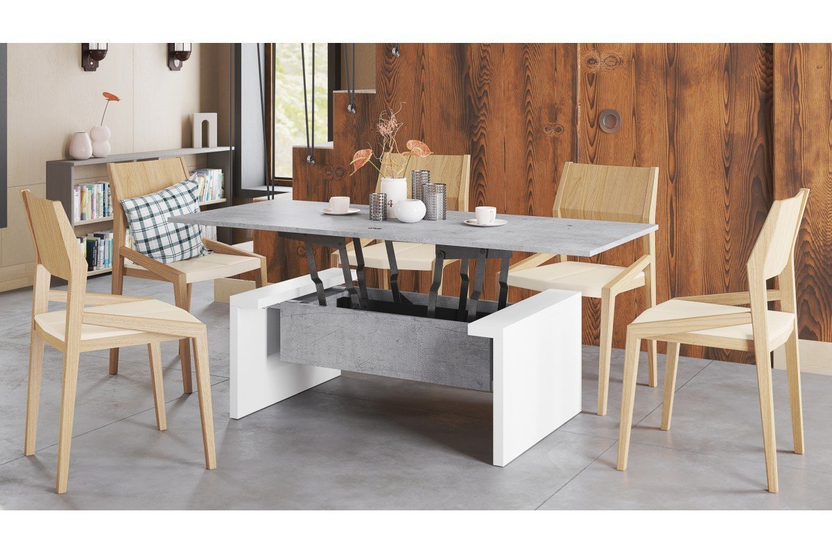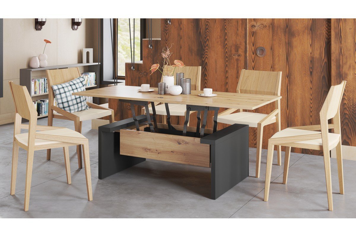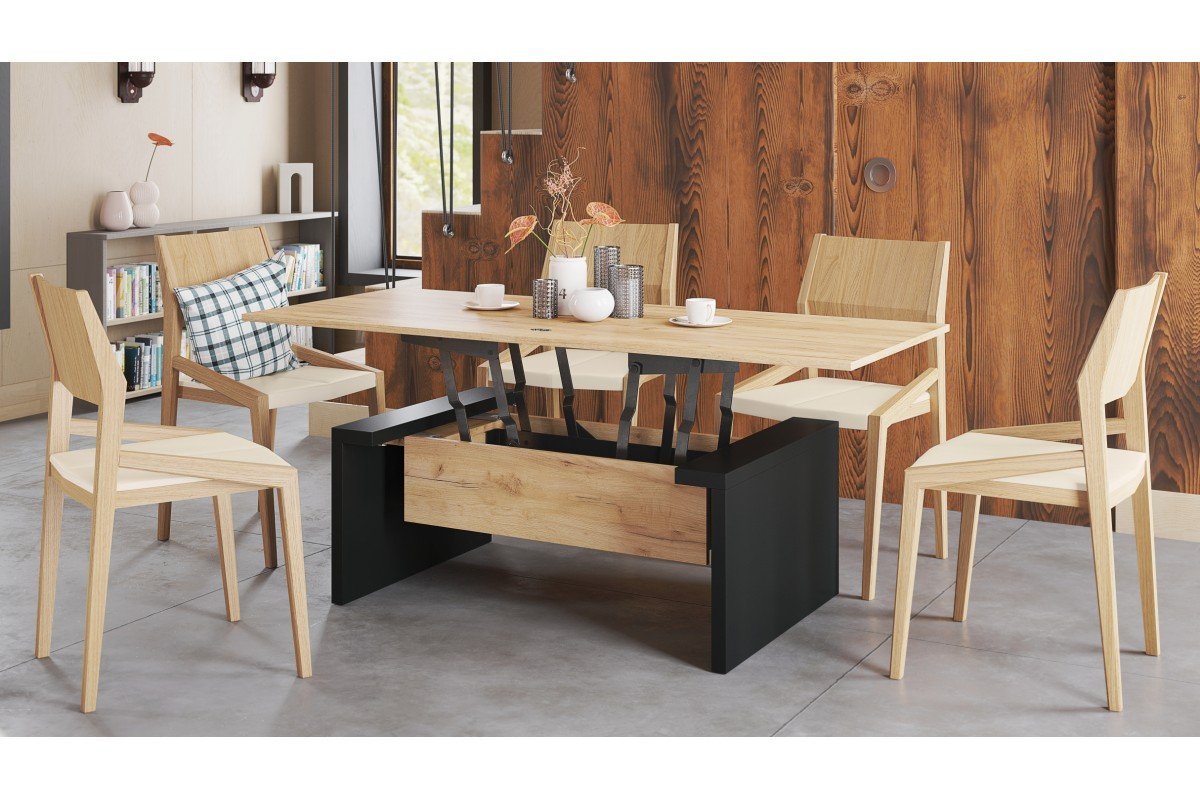 Stalas pagamintas iš 18 mm ir 28 mm storio matinės medžio drožlių plokštės, laminuotos iš abiejų pusių, apdailintos 1 mm ABS briauna. Tvirtos stalo kojelės garantuoja tvirtą stabilumą ir atsparumą didelėms apkrovoms. Aukštos kokybės milteliniu metodu dengta juoda stalo kėlimo įranga užtikrina lengvą ir patogų stalviršio išskleidimą. Stalą transformerį labai lengva prižiūrėti ir valyti. Valymui tinka, bet kuri neagresyvi priežiūros priemonė skirta laminuotai plokštei.